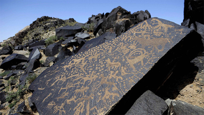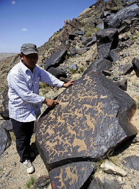 新华网阿拉善6月20日电 位于内蒙古阿拉善戈壁深处阿拉善右旗孟根苏木(乡)约14公里的曼德拉山,在其18平方公里的山石间,分布着4000多幅岩画,雕刻精湛,图案逼真,形象生动,古朴粗犷,年代久远,内容记载了当时的经济、文体、生活情景和自然环境、社会风貌。其题材广泛,内容丰富,堪称中国西北古代艺术画廊,对研究中国古代游牧民族的社会发展史、民族史、畜牧史、美术史具有极高的艺术价值。