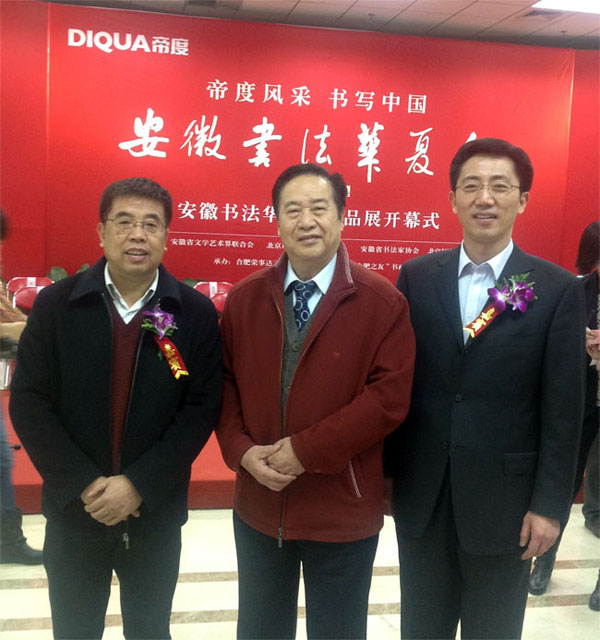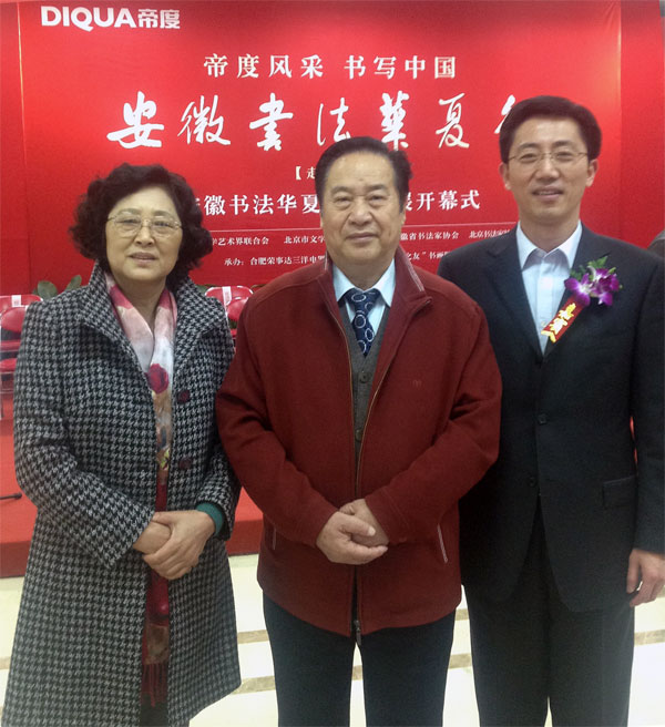 2012年11月21日,中国书画艺术研究院院长罗序伦先生与夫人焦传粹女士出席安徽书法华夏行在京展览开幕式,图为与合肥巿政协秘书长袁文长先生,合肥巿驻京办王庆斌主任合影留念。